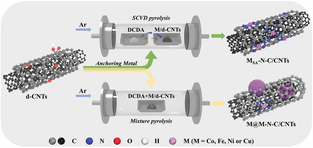 针对酸性环境下电催化剂稳定性差、氧还原反应动力学缓慢等关键问题,suncitygroup太阳集团功能分子器件团队提出了一系列创新设计策略,以精准调控氧物种在活性位点上的吸附与还原行为。团队发展了一种基于“分离气相化学沉积”的普适性方法,在碳纳米管载体上构筑同轴钴-氮-碳单原子催化剂。所制备的同轴结构单原子催化剂在酸性电解液中展现出优异的氧还原活性、选择性与长期稳定性,实现了超过100小时的稳定高效电合成过氧化氢性能。相关成果以Coaxial Metal-Nitrogen–Carbon Single-Atom Catalysts Boost Acid Hydrogen Peroxide Production为题发表于材料领域中国科公司一区TOP期刊Advanced Functional Materials杂志,suncitygroup太阳集团张建教授、卢兴教授为该论文的通讯作者。