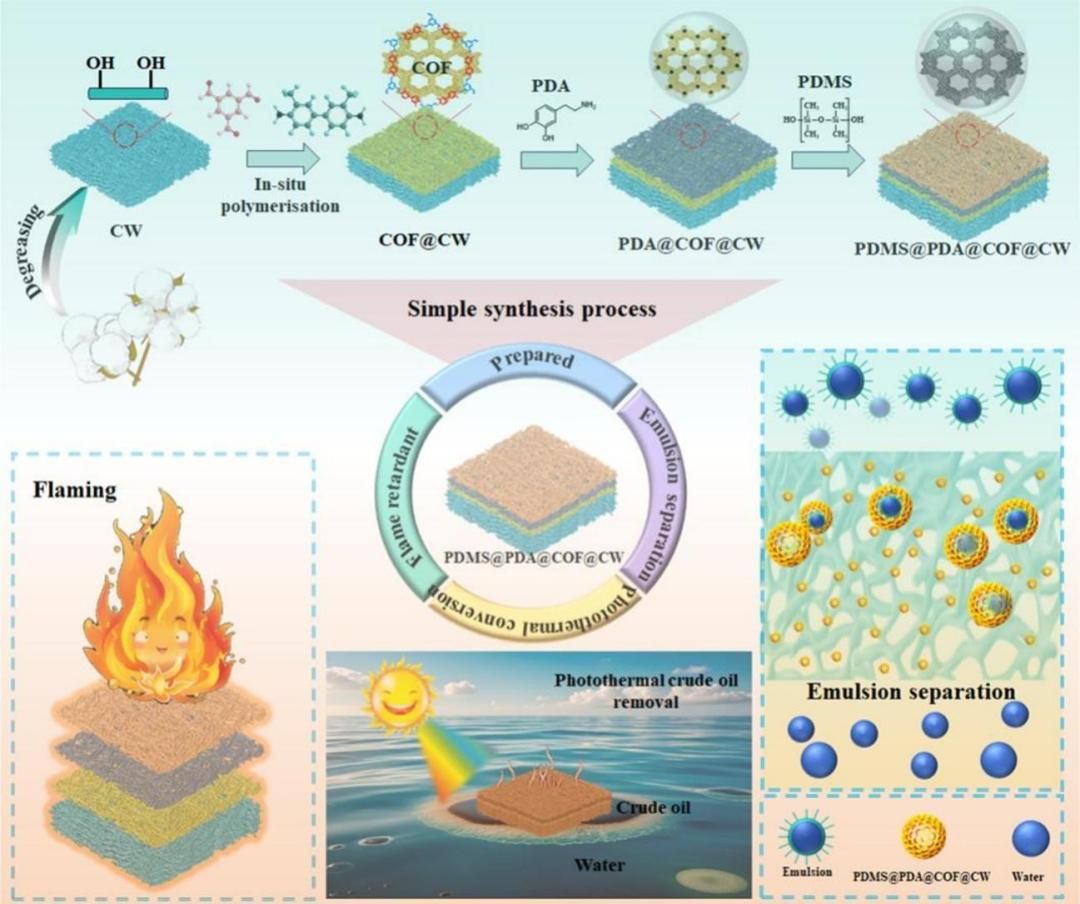 进展二:用于海上溢油高效处理的光热活性超疏水夹层结构三维共价有机框架复合材料