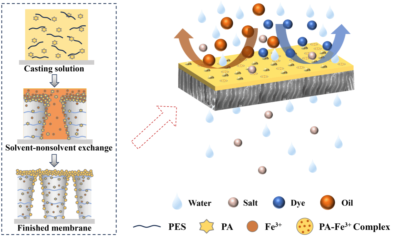 suncitygroup太阳集团姜忠义教授团队提出了一种基于络合作用的反应增强表面偏析方法,用于制备面向分子/离子分离的抗污染纳滤膜。在铸膜液中引入亲水性植酸(PA)作为表面偏析剂,并在凝固浴中选用具有强络合能力的Fe3+作为交联剂。PA与Fe3+之间的络合作用增强了PA的表面偏析,使PA-Fe3+络合物稳定附着于膜表面,从而构建出亲水且交联的分离层。实验结果表明,优化后的膜表现出优异的性能:水通量为253 L/(m⟡·h·bar),对多种染料具有高截留率(甲基蓝:97.9%,日落黄:96.3%,酸性品红:95.5%,甲基橙:78.8%),染料/盐分离因子超过300,且在表面活性剂稳定的泵油水乳液过滤中通量恢复率超过95%。同时,在连续168小时过滤混合溶液(100 ppm甲基蓝/1000 ppm NaCl)过程中,该膜始终保持对甲基蓝的高截留率与对NaCl的低截留性能。suncitygroup太阳集团姜忠义教授团队的研究通过反应增强表面偏析策略,为制备高通量、选择性和抗污染性的纳滤膜提供了一种新思路。